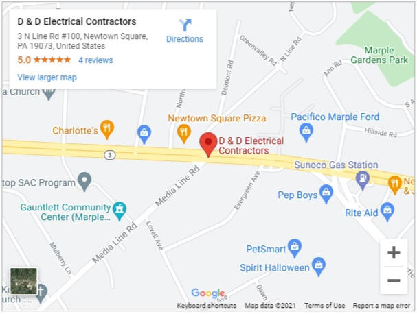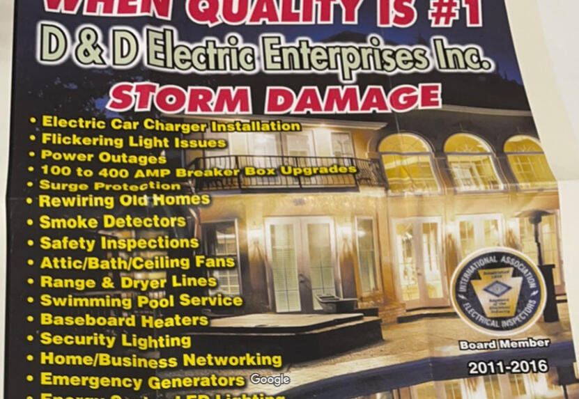 D & D Electric Enterprises, Inc. has been serving Delaware, Montgomery & Chester counties since 1987. We provide complete electrical repairs, installations and so much more! We offer a one-year labor guarantee on all installations. We are fully licensed and insured electrical contractors.