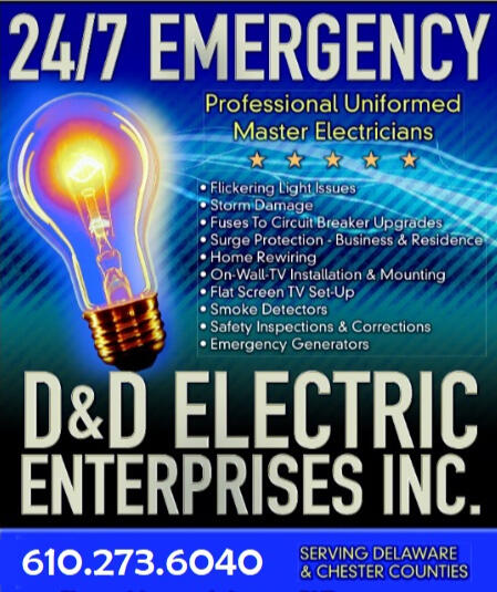 D & D Electric Enterprises, Inc. has been serving Delaware, Montgomery & Chester counties since 1987. We provide complete electrical repairs, installations and so much more! We offer a one-year labor guarantee on all installations. We are fully licensed and insured electrical contractors.